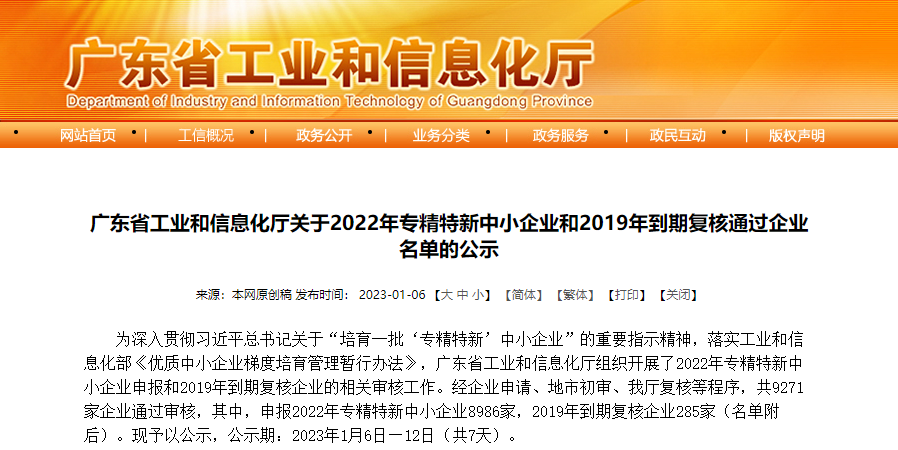 近期,广东省工业和信息化厅公示了2022年专精特新中小企业的认定名单,K8凯发(中国)光电位于其中。